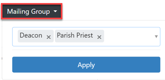 To search for users with a specific mailing group, click on the Mailing Group button (#3 in the screenshot above) and choose the relevant group from the dropdown list then click 'Apply', as shown below.