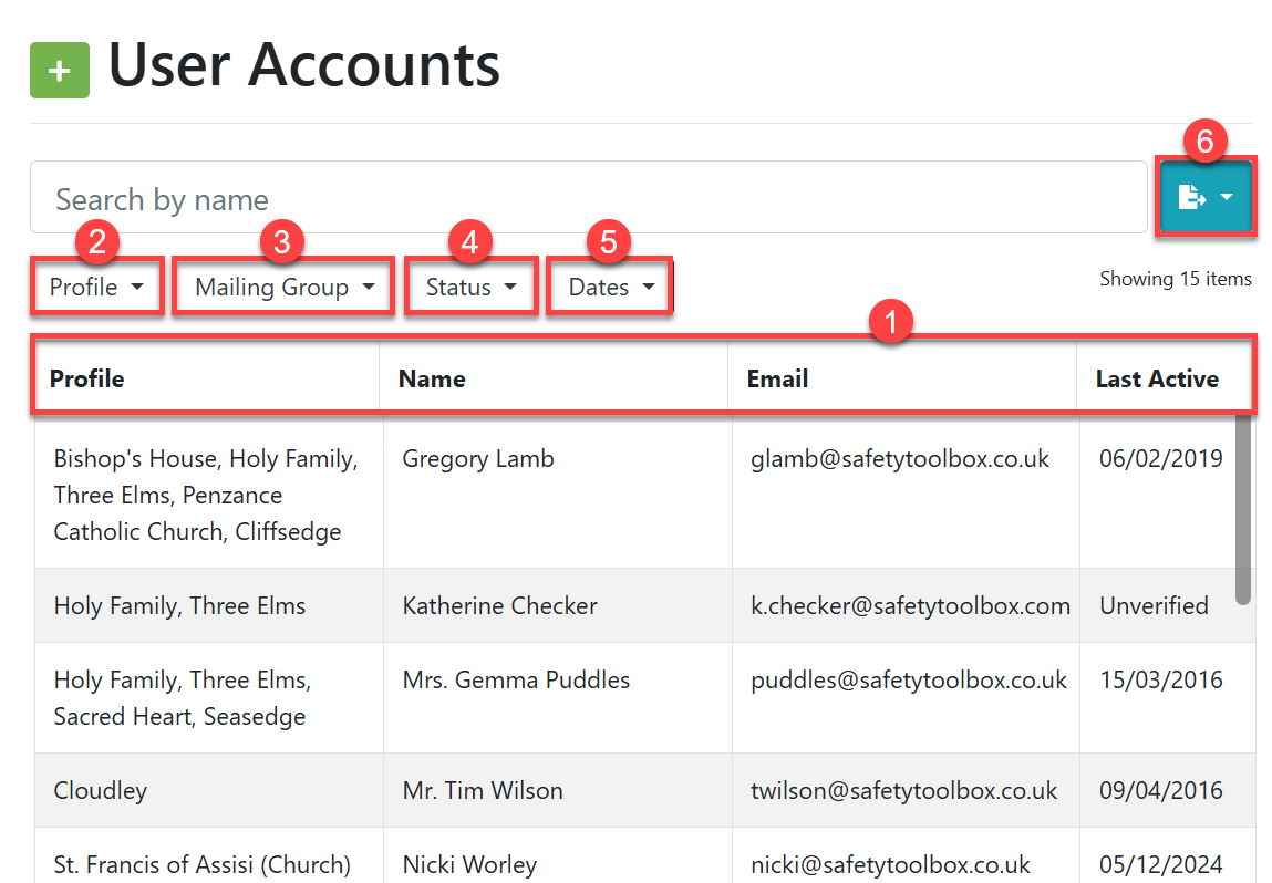 The User Accounts page displays four columns (#1 in the screenshot): 'Profile', which lists each profile the user has permission to access, 'Name', 'Email address' and 'Last Active'.