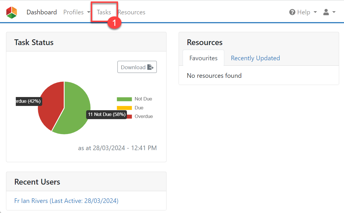 1. First you will need to locate the task which you would like your sub-task to be added to. You can locate the task list by selecting Tasks from the header bar (#1 in the screenshot below).