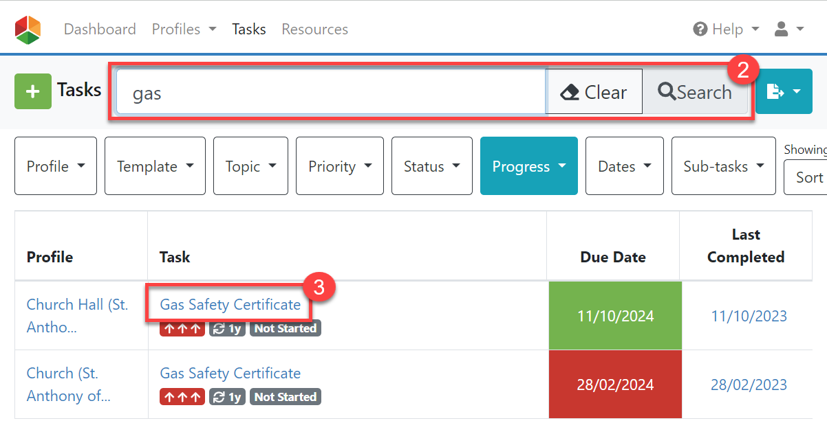 2. Search for the task within search bar (#2 in the screenshot below) and open it by clicking on the title of the task (#3 in the screenshot below).