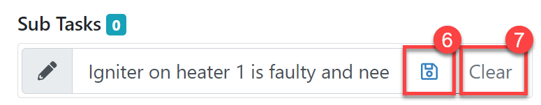 4. To create your sub-task, click in the box where it says "What needs to be done?" and type the details of your sub-task. As you type in the box, two buttons will appear to the right - The save button (#6) will save your sub-task and the clear button (#7) will cancel it if you decide not to save it. Alternatively, you can press the 'enter/return' button to save the sub-task and 'escape' to clear or cancel.