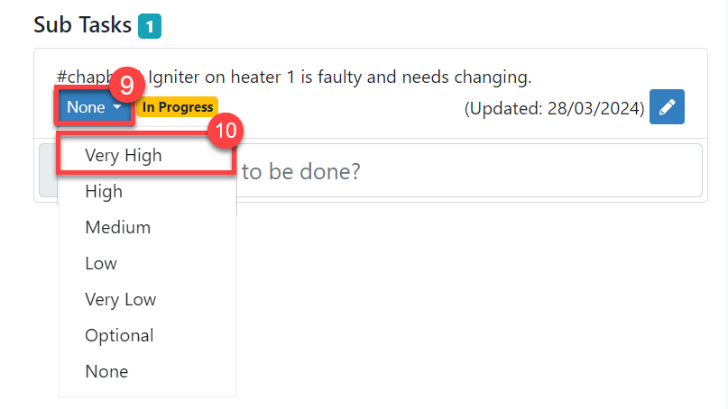 6. At this point, you should assign an urgency level to the sub-task, by selecting the 'None' button (#9 in the screenshot below) and choosing the appropriate level of urgency from the dropdown list (#10 in the screenshot below).