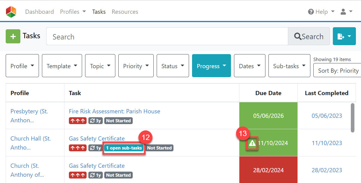 8. From the Tasks list, the number of open sub-tasks can also be seen at a glance, (#12 in the screenshot below). In addition, a warning triangle indicates that whilst the task itself is not due, it has sub-tasks outstanding (#13 in the screenshot below).