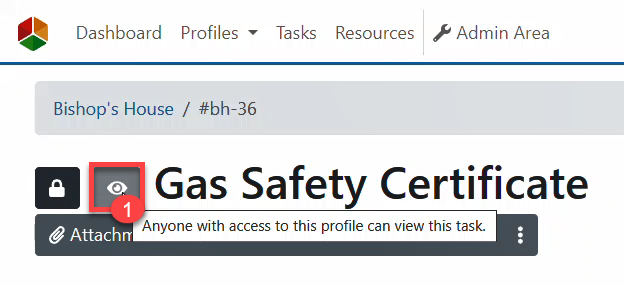 Users with administrator permissions can see whether or not a task is 'confidential', by first opening up a task or sub-task and looking at the eye image next to the task title (#1 in the screenshot below). If you hover your mouse over the eye, help text will appear to explain who can view this task. In the example below, anyone with access to the profile can view the task, so it is a non-confidential task.