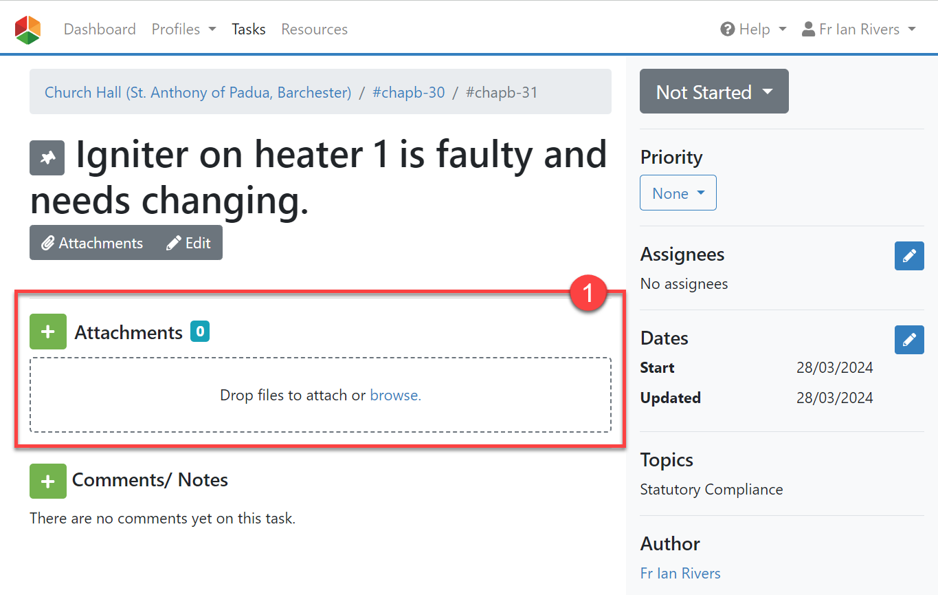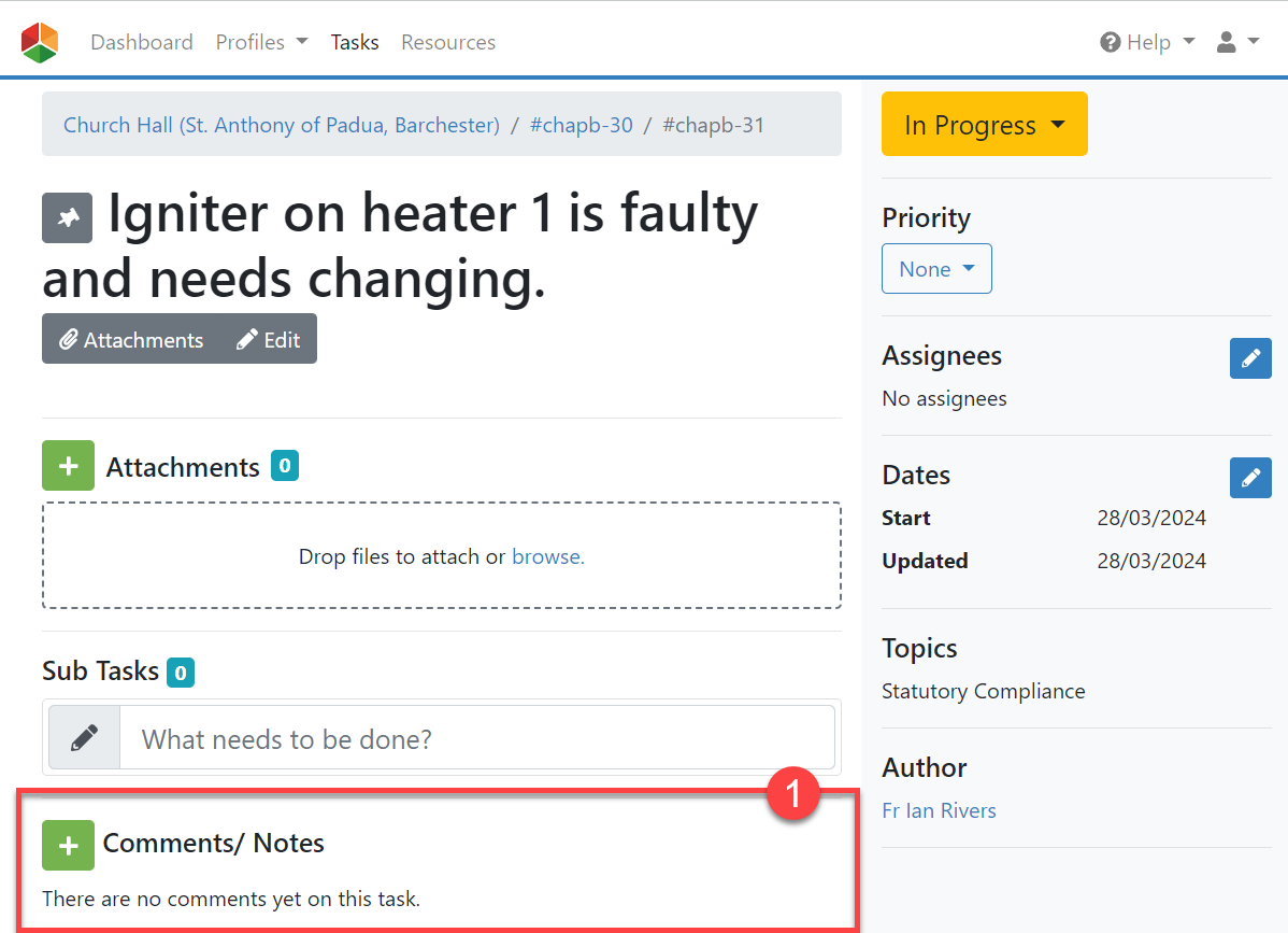 Sub-tasks work in the same way as regular tasks, if a task has sub-tasks these will be listed within the Sub-Tasks section on the Task Page (#1 in the screenshot below). Click on the sub-task you wish to update to open it.