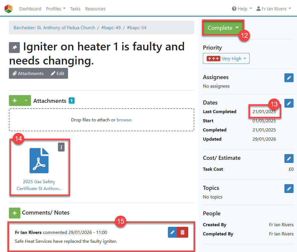 There is attached evidence of the work that was completed (#14 in the screenshot above) - see guidance on attaching a file. E.g. invoices for remedial work, photographs, and certificates.