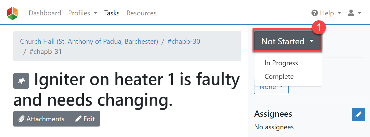 - In Progress - If you have started work on the task (e.g. you've obtained quotations for the work but it is yet to be carried out) but it is not yet completed, you can manually change the status to 'In Progress' from this menu.