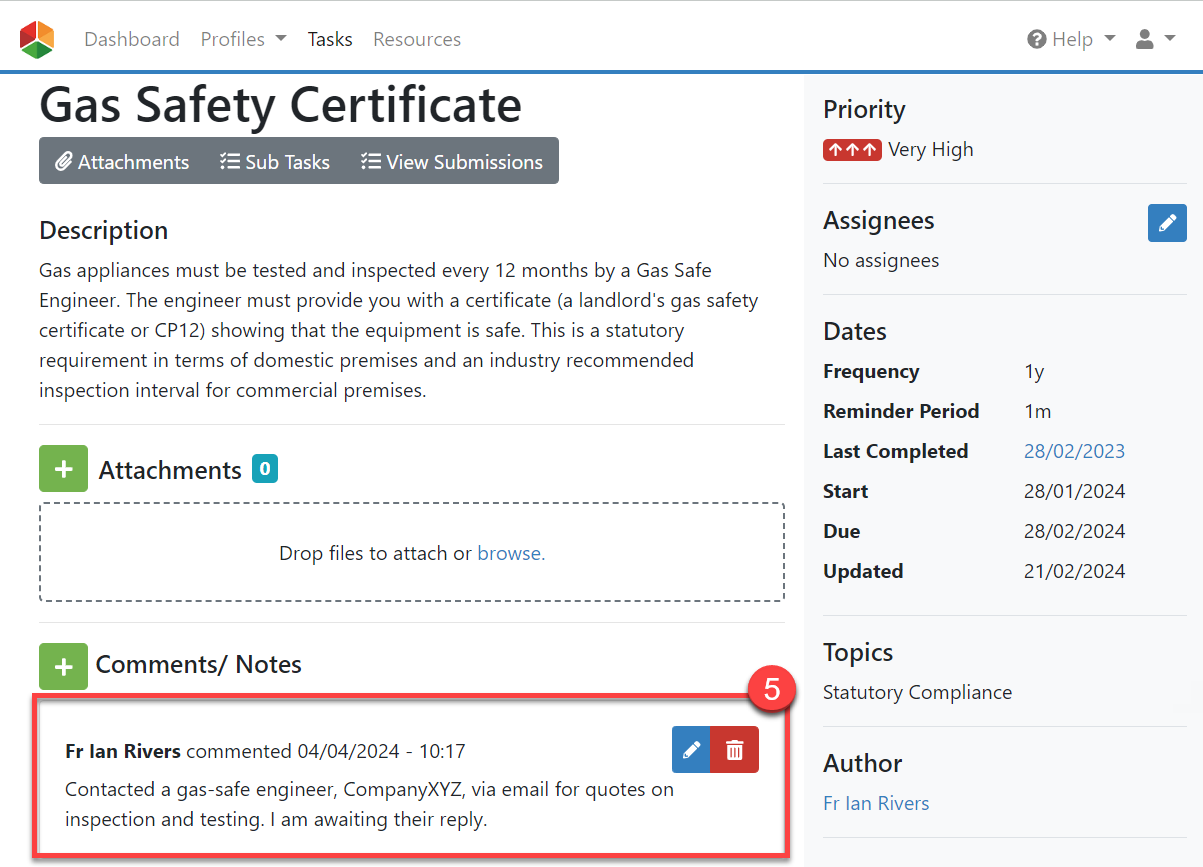 3. Once saved, Comments/ Notes will be visible to anyone who can view the task. Your comment will then be listed in the comments/ notes section of the task page (#5 in the screenshot below).