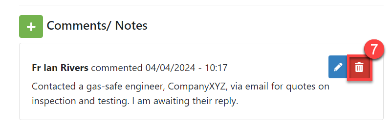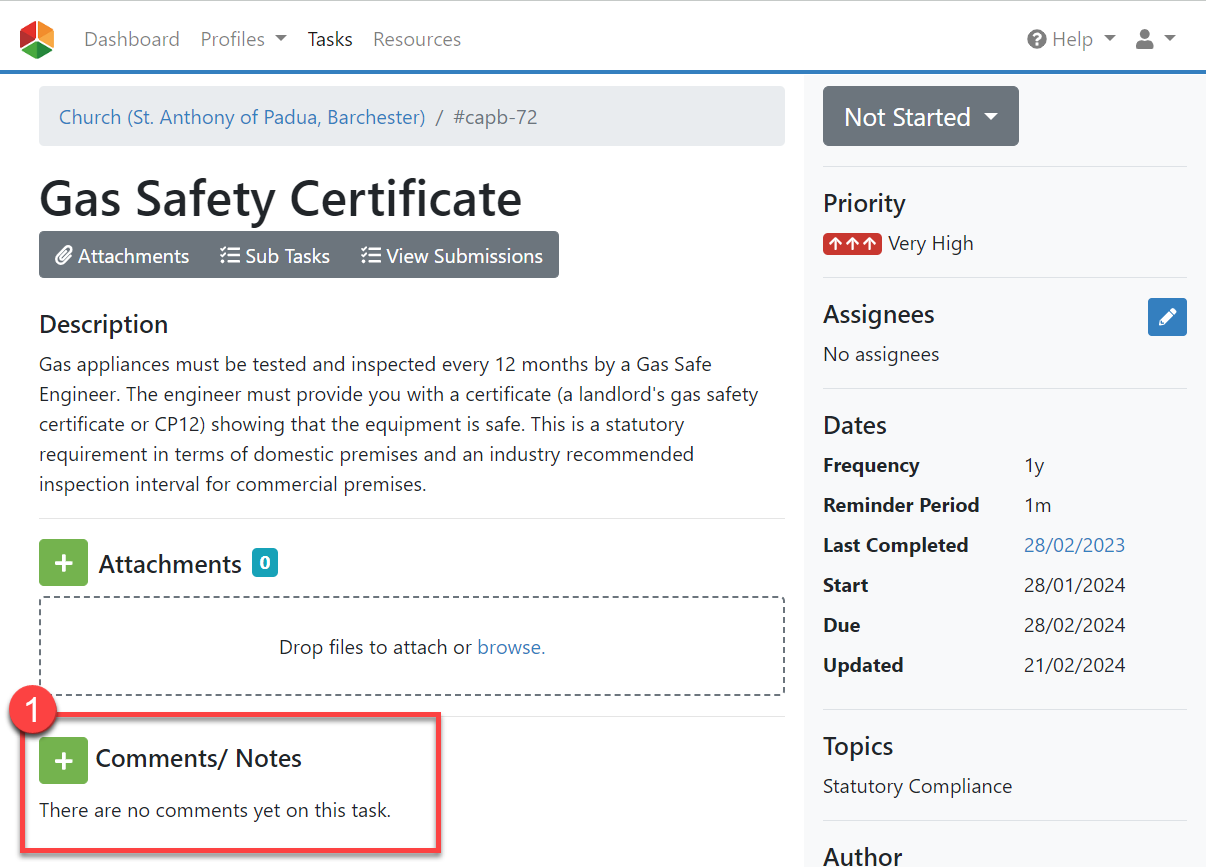 1. From the task page, locate the Comments / Notes area, and to add a comment or note, click on the green 'plus' button. (#1 in the screenshot below).