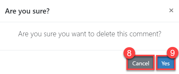 6. You will then see a pop-up window to confirm you do want to delete the comment. Click Yes to permanently delete the comment (#8 in the screenshot below), or cancel to be returned to the task page (#9 in the screenshot below).