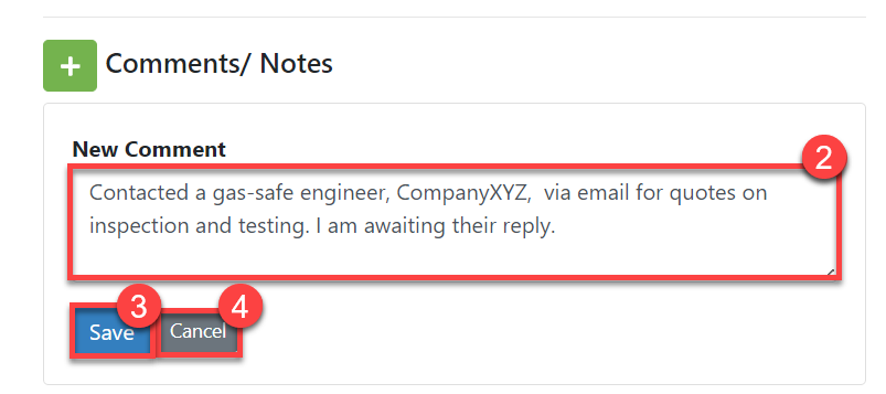 2. You can add comments/ notes to any task which will appear at the bottom of the task screen in the order they were created, most recent first. Type your comment in the box as shown in red box (#2 in the screenshot below) then click on 'Save' to save it (#3 in the screenshot below) or 'Cancel' to cancel (#4 in the screenshot below).