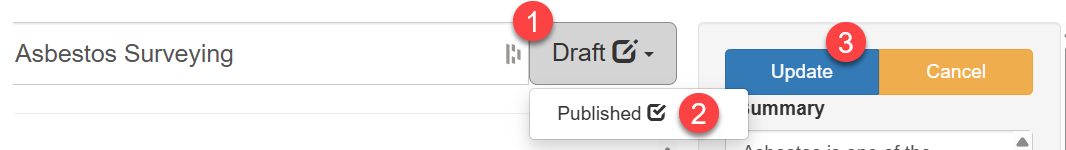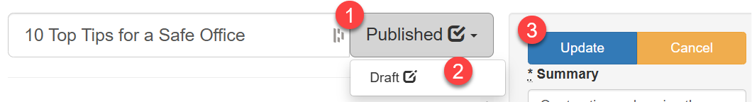 From within the resource editor page, select the Draft button (#1 in the screenshot below), and select Published (#2 in the screenshot below). Then Update (#3 in the screenshot below).
