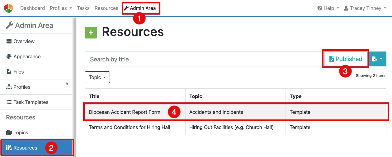 Open your Resource by going to the Admin Area (#1 in the screenshot below) and clicking on 'Resources' (#2):