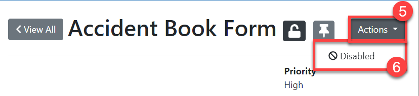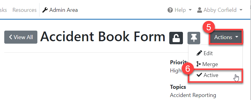 4. From the task template page, select 'Actions' which will reveal a drop down list (#5 in the screenshot below). Select the option 'Active' (#6 in the screenshot below).
