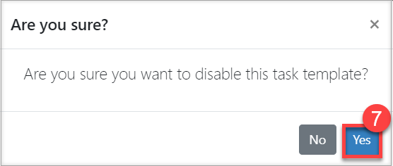 5. You will be asked to confirm that you wish to disable the task template. Select 'Yes' (#7 in the screenshot below).