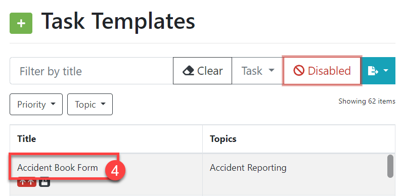 4. Now you will only be shown tasks which have been disabled. When you have located the task template, select the title (#4 in the screenshot below).