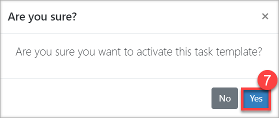7. You will be asked to confirm that you wish to activate the task template. Select 'Yes' (#7 in the screenshot below).