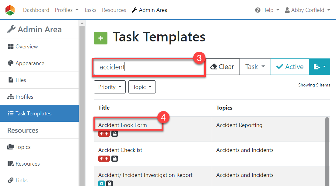 3. Search for the task template you wish to disable. You can scroll through the options or use the search bar (#3 in the screenshot below). When you have located the task template, select the title (#4 in the screenshot below).