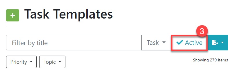 3. In order to locate the task template, select the 'Active' button in the filtering section (#3 in the screenshot below). This will toggle to show only inactive tasks.