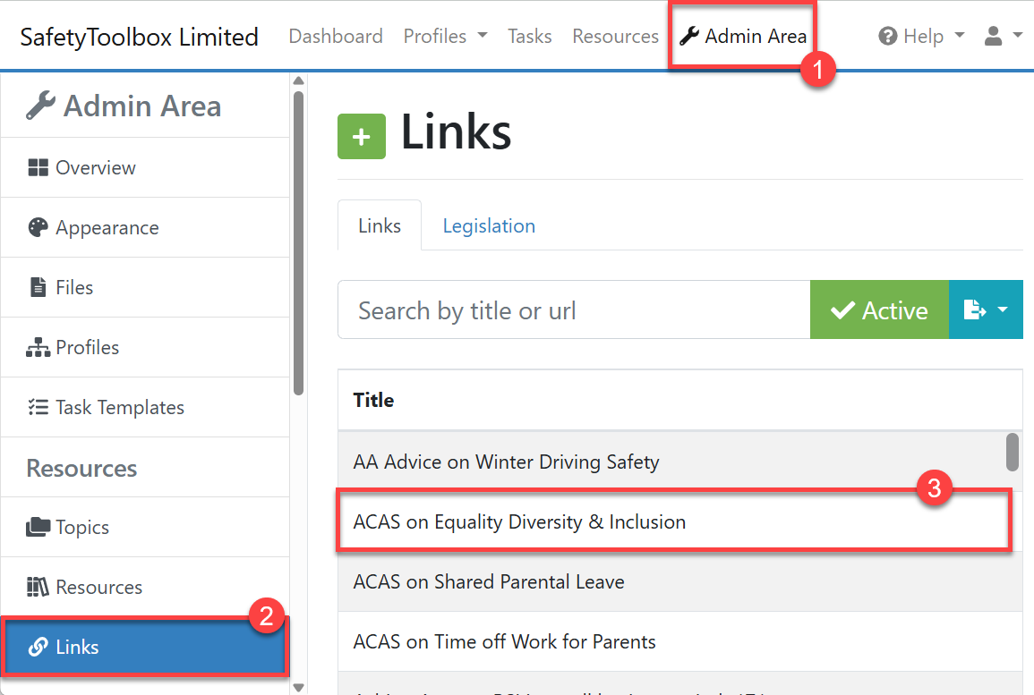 - Firstly, go to Admin Area (#1 in the screenshot below) then click on 'Links' (#2 in the screenshot below):