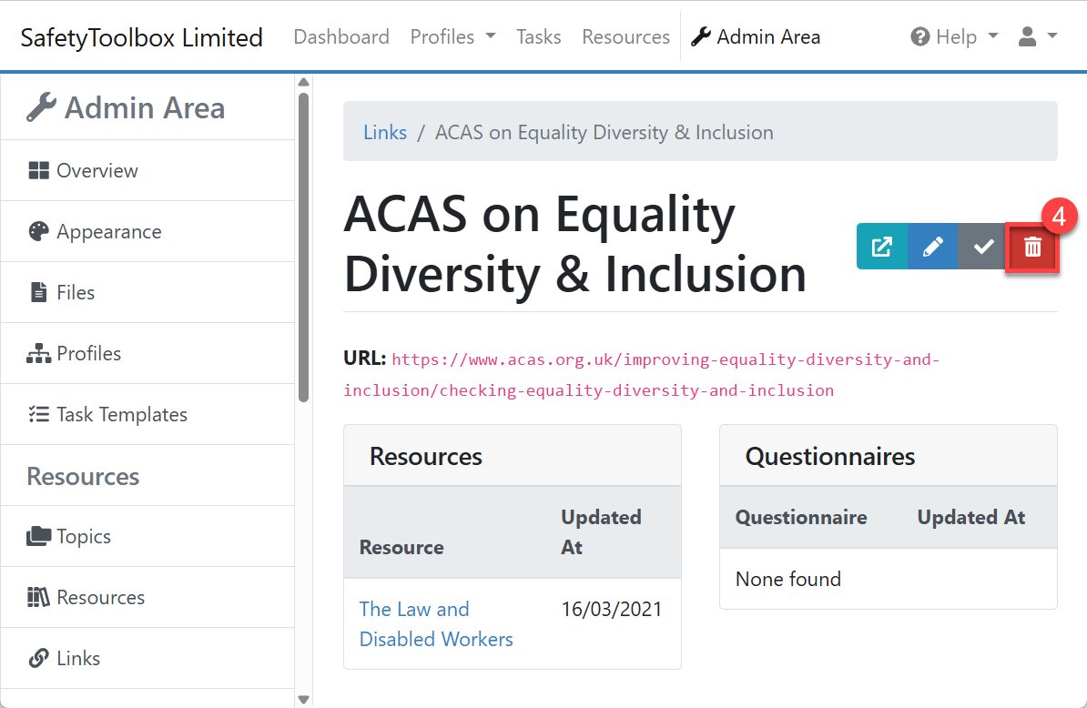 Please note that if you delete or disable a link, it will also automatically be removed/hidden from any Resources/Questionnaires within which it appeared.
