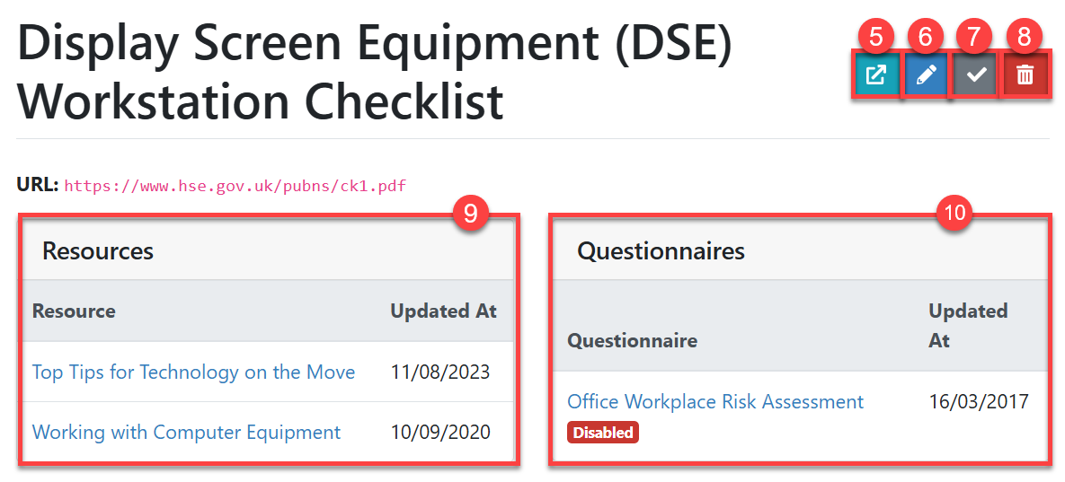 - Current Resources and Questionnaires which display the link: Once you have added your link to any of your Resources Guides or Questionnaires, the names of the Guides/Questionnaires will appear in the relevant sections (#9 and #10 in the screenshot above).